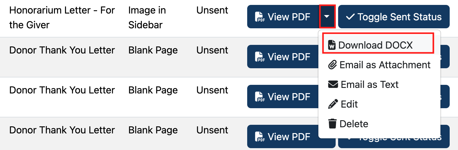 .docx Export – Letters can now be exported from the system as .docx files rather than PDFs, allowing you to edit them outside of the system if needed. You’ll find the option next to any system generated letter: