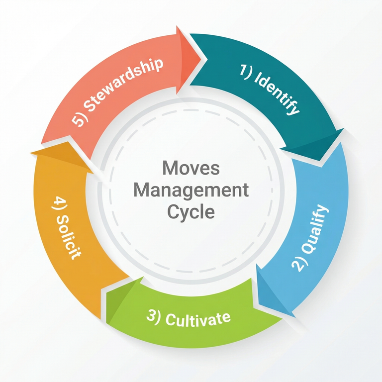 The moves management cycle is the continuous loop of Identify → Qualify → Cultivate → Solicit → Steward, after which a retained donor re-enters the cycle for renewed or upgraded giving. Each stage flows into the next, creating a repeatable system for major gift fundraising.