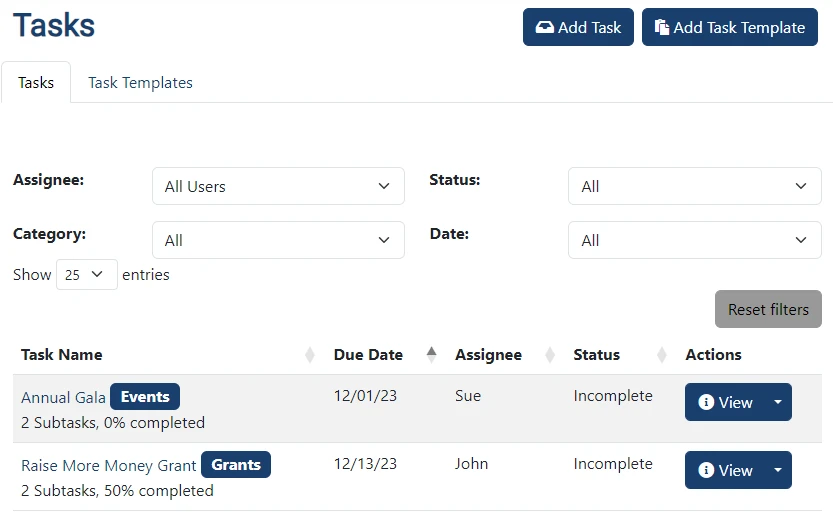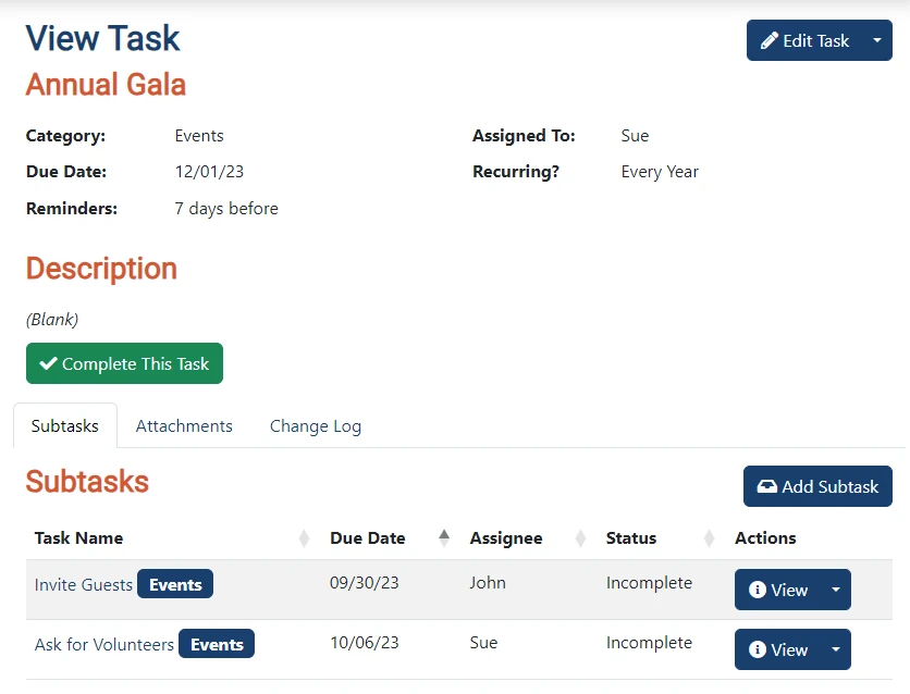 Let’s say your non-profit hosts an annual gala event. There may be many things involved in the planning process. Guests need to be invited, food and entertainment need to be arranged, and a number of volunteers will need to be gathered. Create subtasks for these action items. Subtasks can be used to help organize larger tasks into manageable action items for yourself or team members to accomplish.
