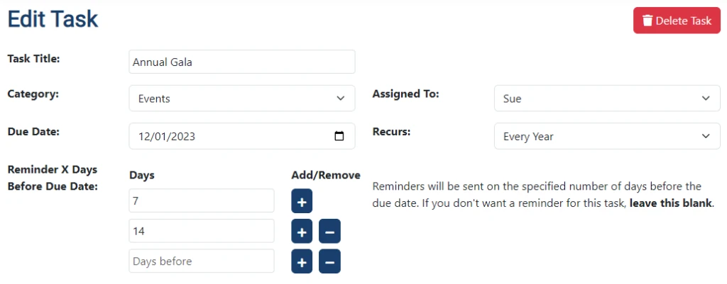 Some activities need to be done regularly. Use Tasks to help yourself and your team remember what needs to be accomplished. Tasks that need to be repeated on a regular basis can be set with deadline reminders for the assignee. You can even arrange for multiple reminders as your due date approaches.