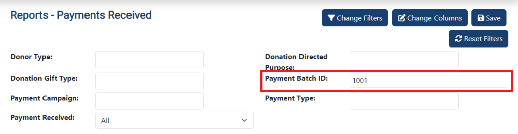 Once you hand week 1’s donations to the bookkeeper and receive the actual Batch ID number used, you will be able to input the correct Batch ID number in the system. Use the Bulk Edit function in reports to change the 1001 placeholder to the actual number used. To do this, add the Payment Batch ID Filter via the Change Filters button in the upper right of the report.