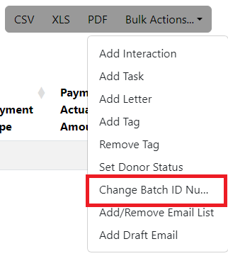 Once you’ve filtered for all of the gifts with the 1001 placeholder, click the Bulk Actions button. Then, select Change Batch ID Number to update them to the correct value.